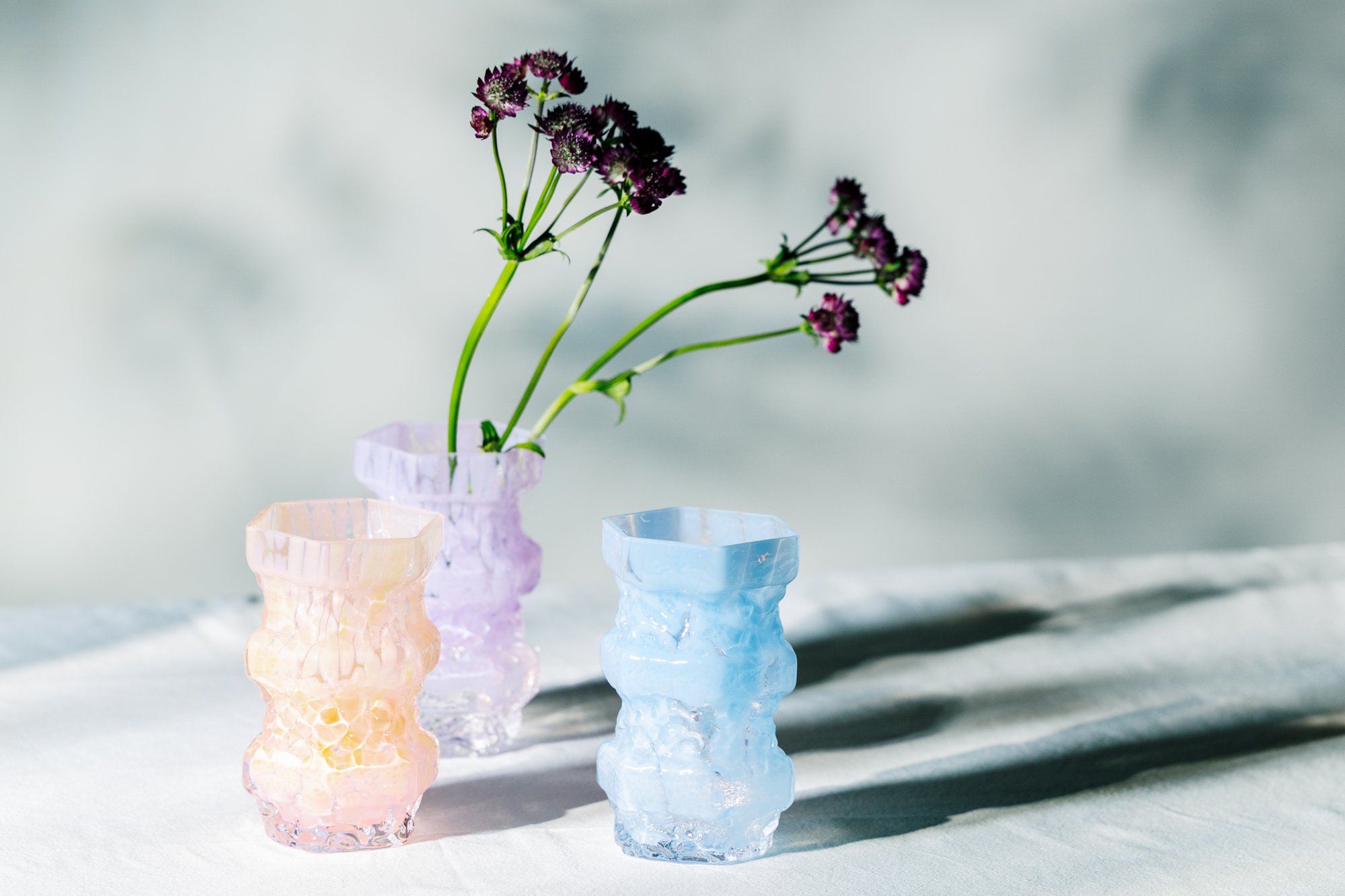 EVIG kommer i tre friske farger: Lyseblå, lavendel og aprikos. Fargene er nøye utviklet for å skape myke skiftninger i lyset, og gir vasen et poetisk og drømmende uttrykk. EVIG er skapt for å være like vakker med blomster som uten.